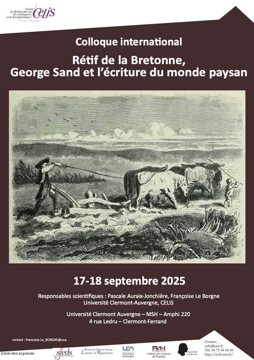 Colloque organisé avec le soutien du CELIS (Université Clermont Auvergne) et de la Société Rétif de la Bretonne, de la Société française d'étude du 18e siècle et celui de la Société des amis de l'équipe Lumières et romantisme