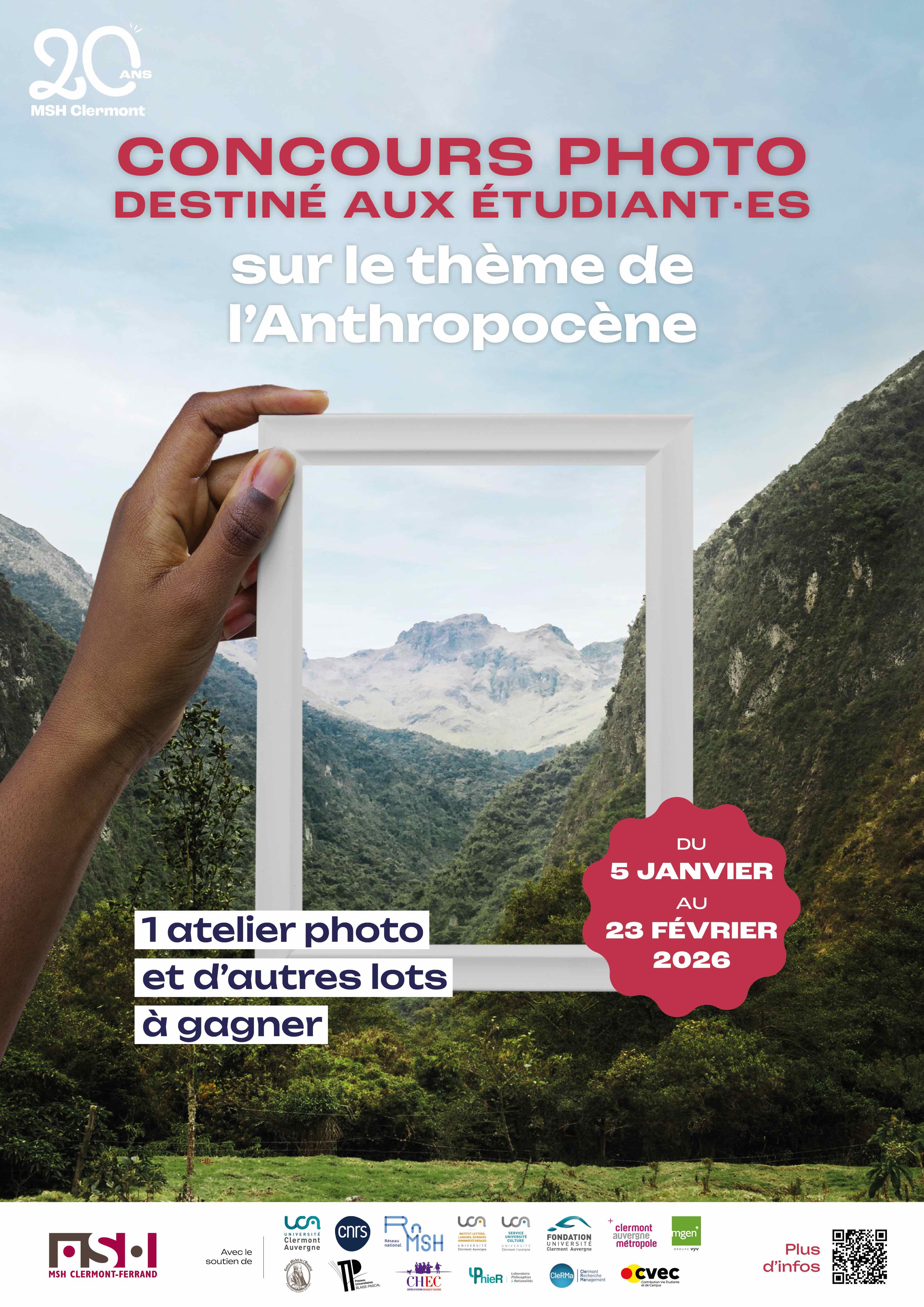 À l’occasion de ses 20 ans, la Maison des Sciences Humaines de Clermont-Ferrand organise, du 5 janvier au 23 février 2026, un grand concours photo ouvert à l’ensemble des étudiant·es de l’UCA, sur le thème de l’Anthropocène. Le jury sélectionnera 30 photographies qui feront l’objet d’une exposition à la MSH et trois lauréat·es seront récompensé·es (lots à gagner). Ouvrez l’œil et exprimez, à travers la photo, votre vision de l’empreinte humaine sur le monde !