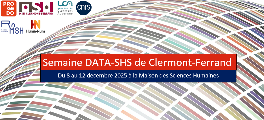 Chaque année, la Semaine Data-SHS offre à la communauté des sciences humaines et sociales une occasion privilégiée de plonger dans les enjeux actuels de l’analyse quantitative en science humaine et sociale : de la collecte à l’analyse, de la gestion à la diffusion des données. Sous l’égide de PROGEDO, cet événement se décline dans le réseau des Plateformes Universitaires de Données (PUD) et mobilise chercheurs·ses, ingénieur·e·s, doctorant·e·s et étudiant·e·s autour d’ateliers pratiques, conférences, présentations de jeux de données et retours d’expérience. Une belle occasion d’apprendre, d’échanger et de (re)découvrir tout le potentiel des données SHS dans une ambiance conviviale ! L'édition Clermontoise de l'année 2025 se déroulera du 8 au 12 décembre à la Maison des Sciences Humaines.