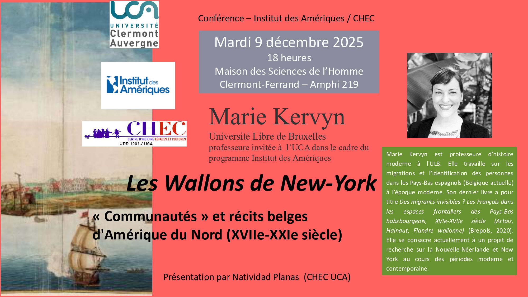 Le Centre d'Histoire Espaces et Cultures et l'Institut des Amériques organisent une conférence de Marie Kervyn (Université Libre de Bruxelles) intitulée « Les Wallons de New-York « Communautés » et récits belges d'Amérique du Nord (XVIIe-XXIe siècle) ». Elle se tiendra le 9 décembre 2025 à 18h à la Maison des Sciences Humaines de Clermont-Ferrand (amphi 219).