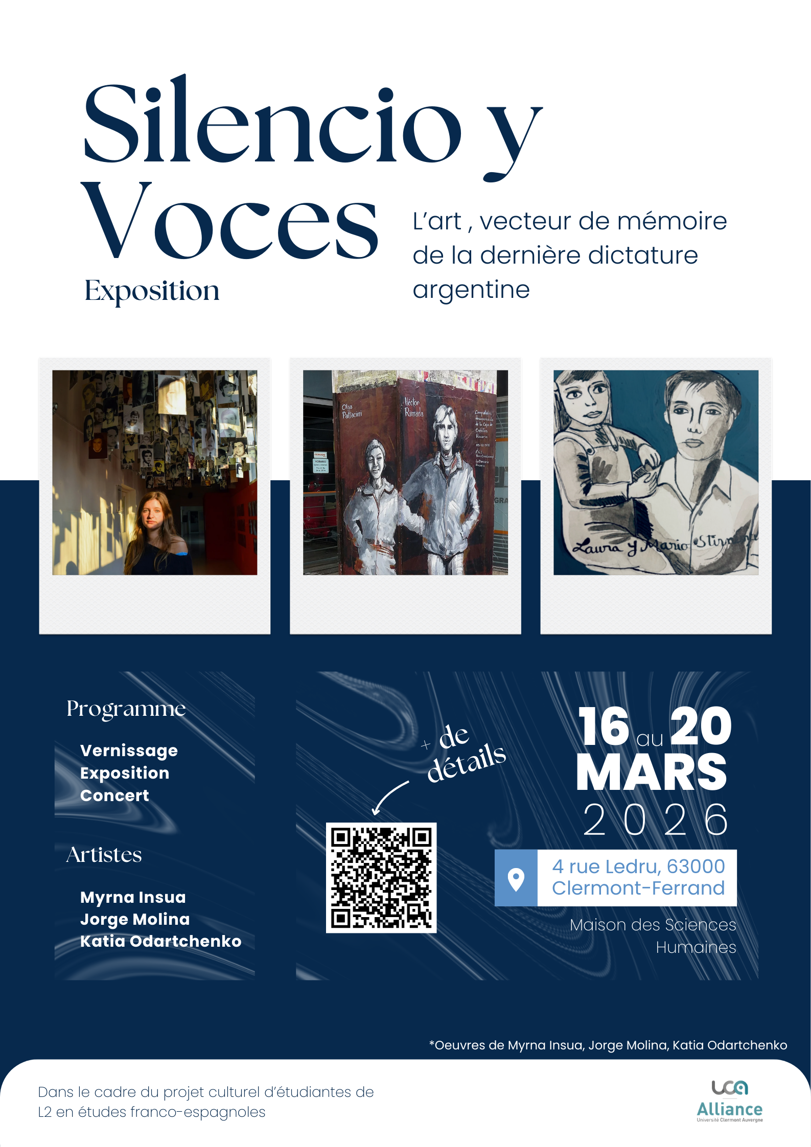 Dans le cadre de la journée d’études « Argentine, 50 ans après le dernier coup d’État. Violence d’État et enjeux démocratiques », l'exposition "Silencio y Voces, l'art vecteur de mémoire de la dernière dictature argentine" aborde le thème à travers le point de vue de la mémoire autant passée qu'actuelle des évènements de la dictature.