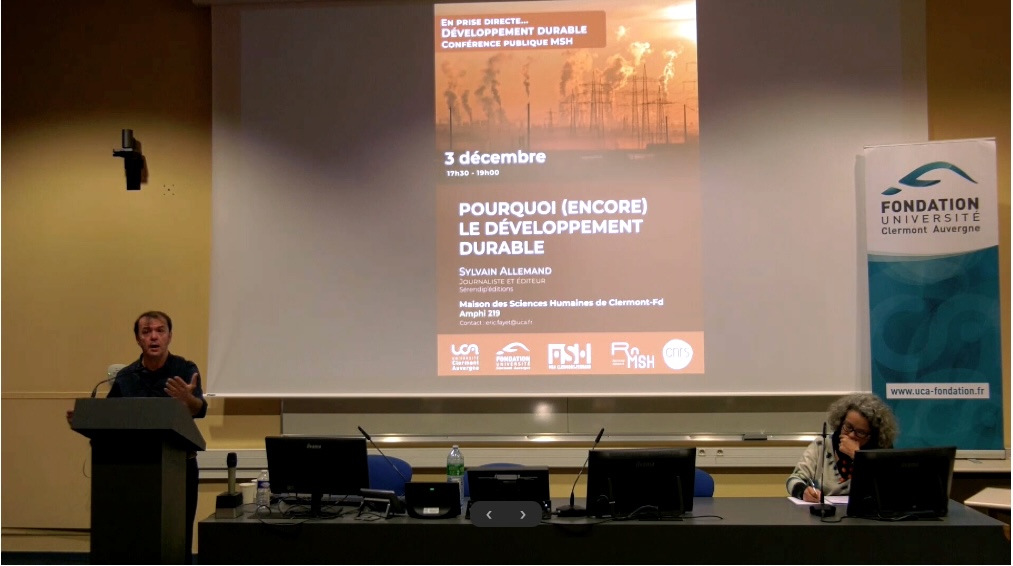 Dans le cadre des conférences en prise directe avec la société de la Maison des Sciences Humaines de Clermont-Ferrand, Sylvain Allemand, journaliste et éditeur (Sérendip'éditions) a donné en décembre 2025 une conférence sur le thème : Pourquoi (encore) le développement durable. Il revient sur la genèse et la diffusion de cette notion pour mieux « rendre enfin justice à son caractère proprement... révolutionnaire ! »