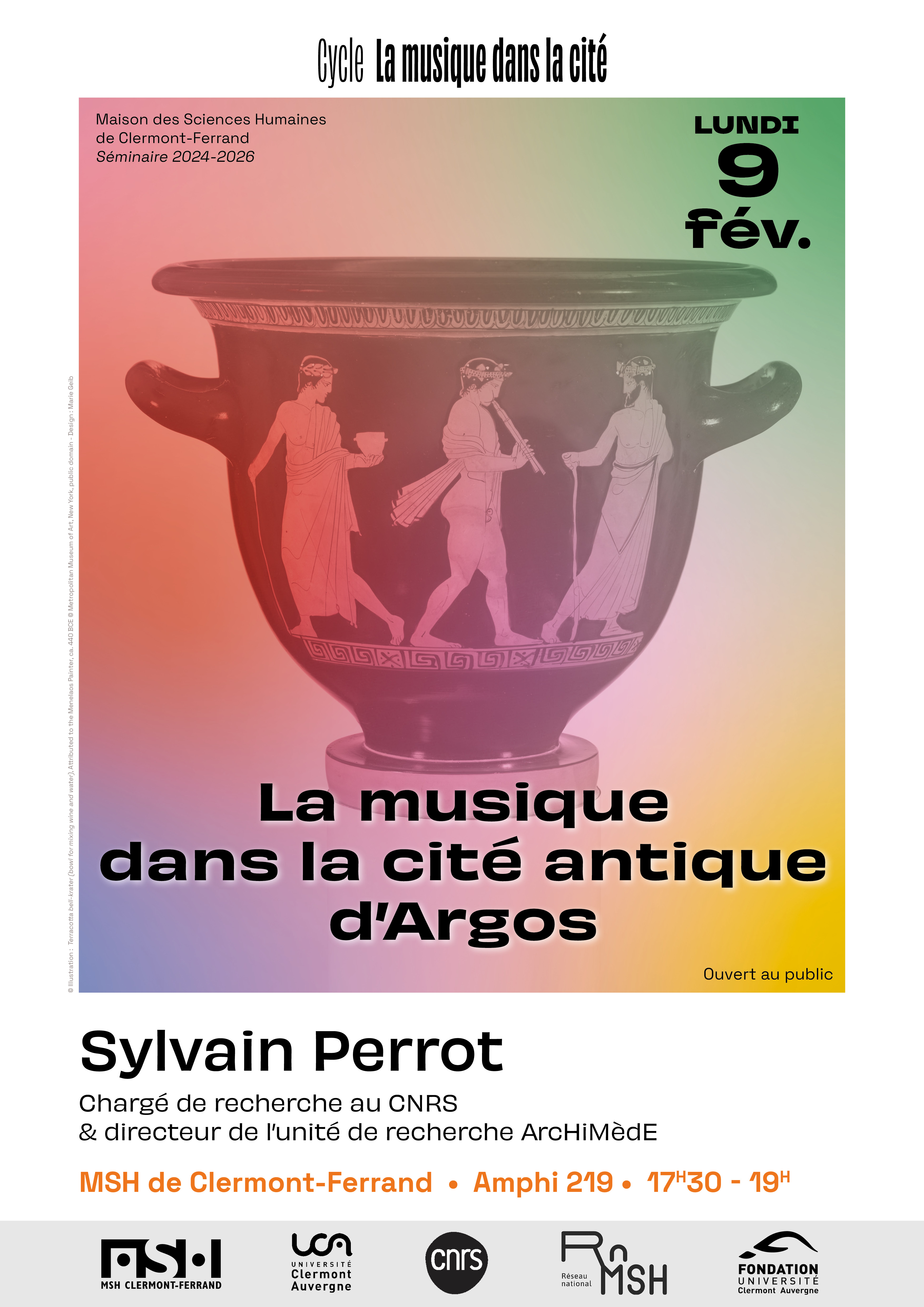 Sylvain Perrot, ancien élève de l’École Normale Supérieure de Paris, agrégé de lettres classiques et ancien membre scientifique de l’École française d’Athènes, est chargé de recherche au CNRS (UMR 7044 ArcHiMèdE) depuis 2018 et directeur de l’unité de recherche ArcHiMèdE (Archéologie et Histoire ancienne : Méditerranée – Europe) depuis janvier 2024, après avoir été directeur adjoint de la Maison Interuniversitaire des Sciences de l’Homme – Alsace (2020-2023). Son domaine de spécialité est la musique, et plus généralement le paysage sonore, du monde grec antique, dans une approche à la fois philologique et archéologique. Il travaille également sur la réception de la musique grecque antique depuis le Moyen Âge jusqu’à aujourd’hui.
